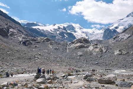 Morteratsch, Switzerland - July 22, 2020: Tourists at Morteratsch Glacier trail