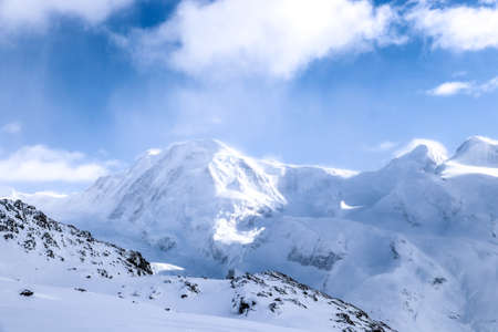 Sunny day with blue sky in the mountains of Switzerland with magnificent views of the snowy Alps and panoramic train. The location of the railway to Gornergrat
