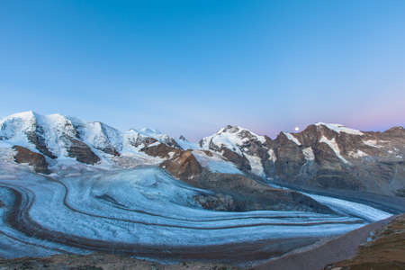 Stunning view of the Bernina massive and Morteratsch glacier at the mountain house of Diavolezza at dawn before sunrise with beautiful sunglow and moon in the sky, Engadine area of Switzerland.