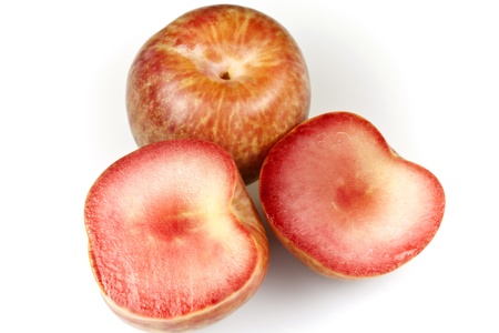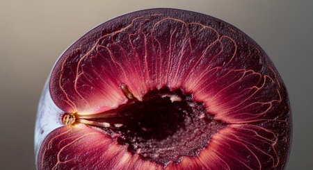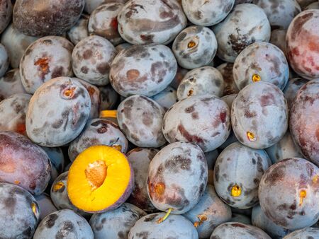 Fresh organic plum fruit on dark background, close up photo from above, slices.
