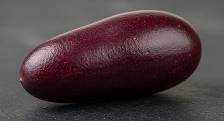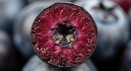 A shiny, dark purple camu camu berry sits next to three round slices revealing pale white flesh and tiny seeds inside. Water droplets enhance freshness of this tart fruit, accompanied by green leaves on rich violet backdrop.