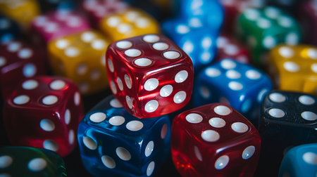 A close-up shot of a pile of colorful dice, including red, blue, yellow, green, black, and pink. The dice have white spots and are arranged randomly.
