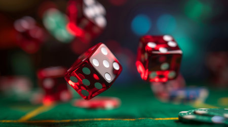 Red dice rolling on a green felt casino table, capturing the excitement and chance of gambling.