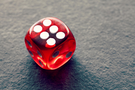 Close up picture of six on a red dice, selective focus, color toning applied.