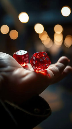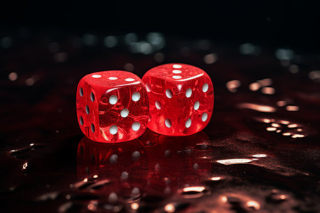 Close-up of vibrant red dice with a glittery effect sitting on a dark surface. The image captures the essence of chance and excitement in games.