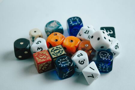 Dice of different faces, d10 and d20, ready to play adventure games. Dice geeks to play. Game dice.