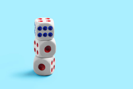 Tower of dices with red and blue pips on blue background