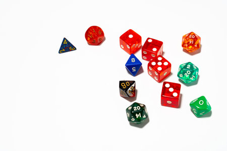 A collection of colorful dice in various shapes and sizes, scattered against a clean white background.