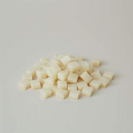 A collection of small, soft white cubes scattered on a light surface, perfect for highlighting culinary creativity in recipes and presentations without distractions.