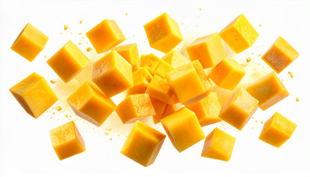 Multiple cheese cubes hover against a clean white background, creating a playful and appetizing food concept Perfect for illustrating healthy eating or culinary themes.