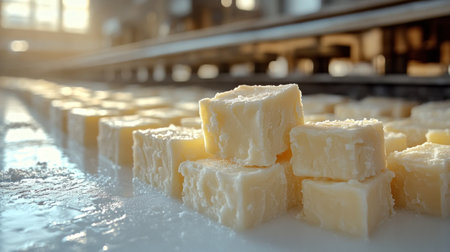 Cubes of cheese rest on a white surface, basking in warm sunlight inside the dairy.