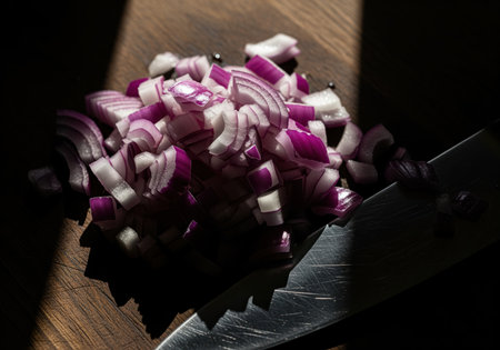 Vibrant purple diced onion pieces piled on a dark wooden cutting board, intensely lit. a sharp knife blade rests nearby, symbolizing food preparation, cooking, and fresh ingredients.