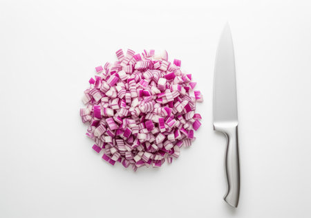 Vibrant diced red onions neatly piled next to a sharp, professional chef knife on a clean white surface. ideal for cooking, food preparation, and healthy eating concepts.