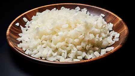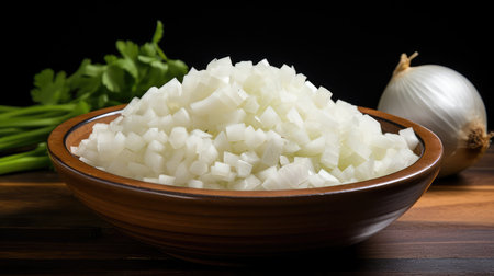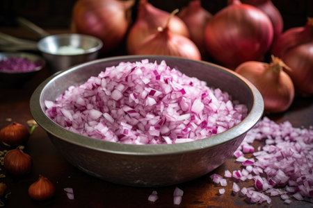 stainless steel bowl filled with finely chopped onions, created with generative ai