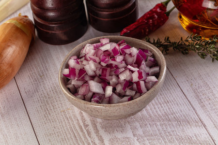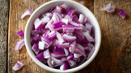 Close-up shot of a white bowl filled with neatly diced red onion pieces, set on a textured rustic wooden surface. Ideal for culinary or food preparation content.