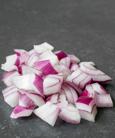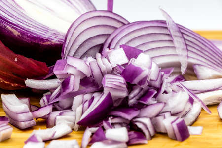 Diced Red Onions. Onions in cubes over a wooden board isolated on white background
