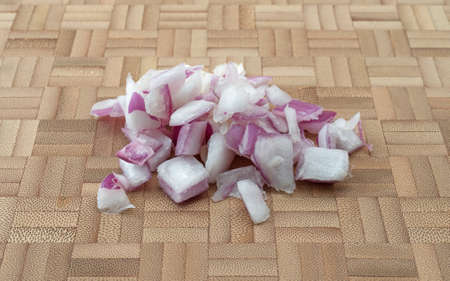 A small portion of freshly chopped red onions on a wood bamboo cutting board.