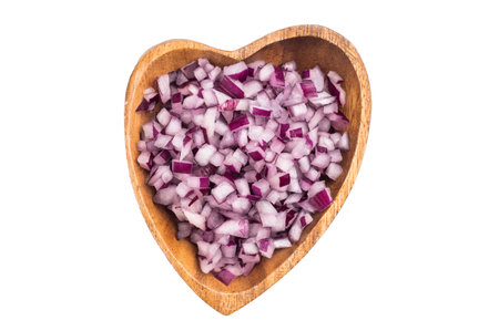 Diced Red onion in wooden bowl isolated on a white background. top view.