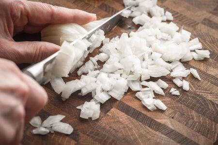 The cook cutting and dice onion on a wooden chopping board. Closeup.