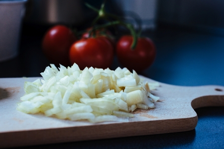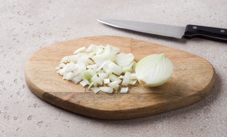 Chopped onion on a wooden chopping board in the kitchen. Preparing dinner