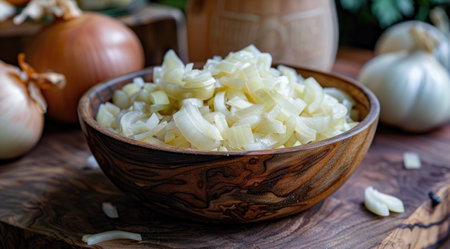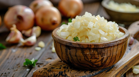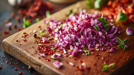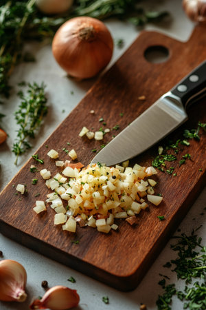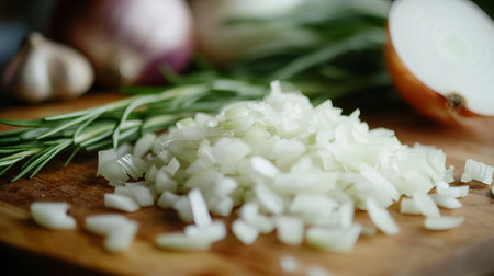 A close-up image of freshly chopped onions on a wooden board, garnished with herbs, perfect for culinary inspiration and recipe ideas.