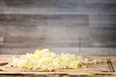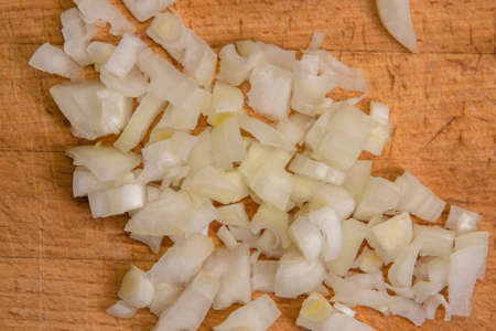 Fresh diced white onion on bamboo cutting board. Allium cepa. wooden background