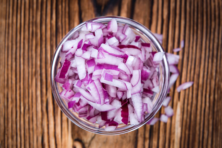 Portion of diced Red Onions (close-up shot) on an old rustic wooden table