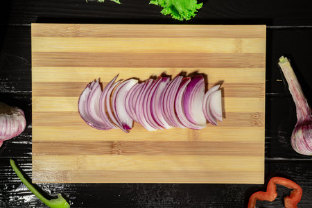 Purple onion, thinly sliced on a striped wooden board. Top view of slices of juicy onion, lettuce, garlic, pieces of red and green sweet pepper. Sliced wet vegetables on a black table close up.