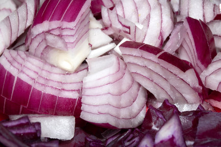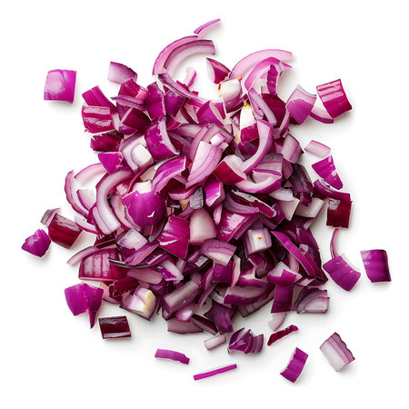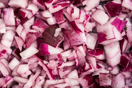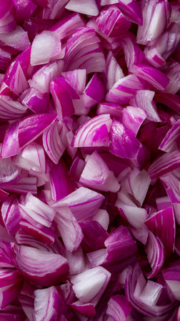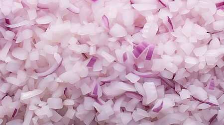 A detailed close-up image showcases a dense pile of freshly diced red onions, highlighting their vibrant purple hues and crisp white inner layers. Ideal for cooking or food themes.