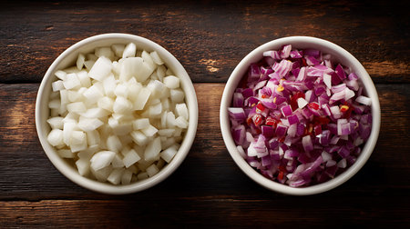 Overhead shot shows diced white onions in one bowl and diced red onions with chili in another bowl, resting on a rustic wooden surface. Food preparation ingredients.