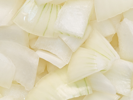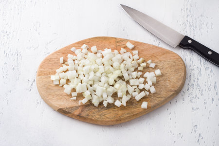 Medium diced onions on white marble background. Photo show how does onion sliced into medium cubes sliced and diced onions look like