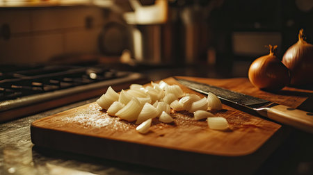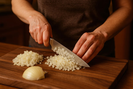 Person skillfully dicing fresh white onion on a wooden cutting board in a cozy kitchen environment with warm lighting.
