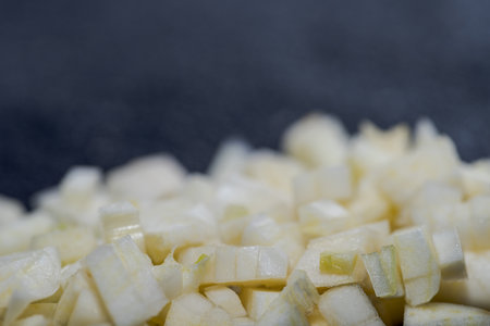Detail of chopped onion placed on dark wooden desk. Preparation of cooking. Fresh, diet and healthy vegetable.