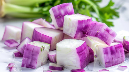 This image features freshly diced purple onion pieces placed on a clean surface, surrounded by herbs. Ideal for culinary projects and recipe inspiration.