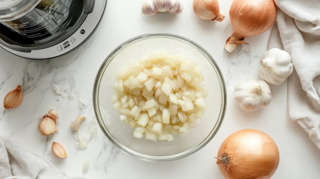 A visually appealing setup featuring chopped onions in a glass bowl, surrounded by whole onions and garlic cloves on a sleek marble surface, perfect for culinary enthusiasts.