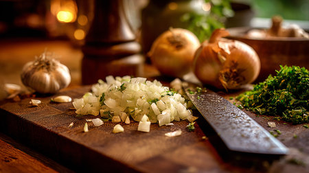 Chopped onions and fresh herbs rest on a wooden surface, waiting to enhance a dish.