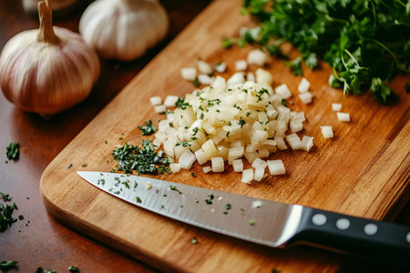 Diced white onions and chopped parsley on wooden cutting board with knife and garlic