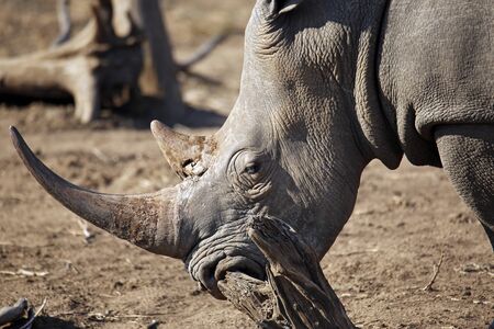 Big white rhino head portrait close up with two horns eating
