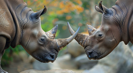Two Rhino Locking Horns Close to the Ground