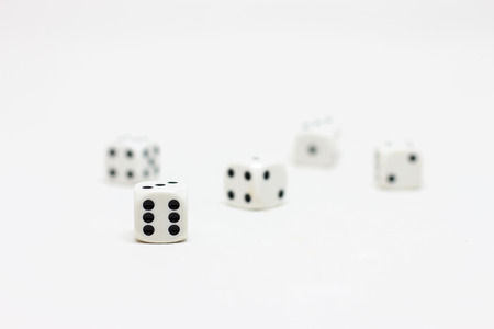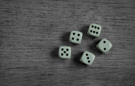 White dice stacked on top of each other on a wooden texture. Casino and gambling concept.