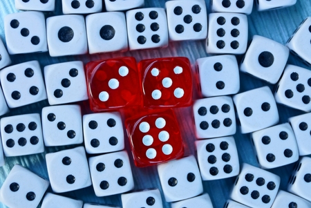 Colorful dices on the blue table. The concept of a casino and a lucky chance to win