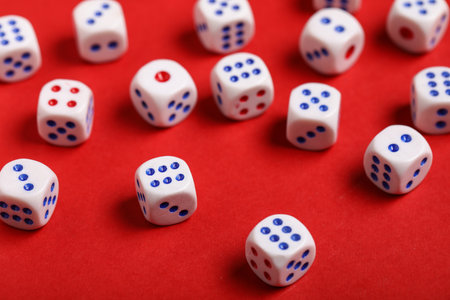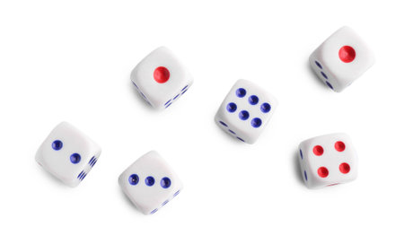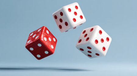 Red and white dice floating in midair, showing numbers with red dots, playful and dynamic on light blue background