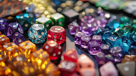 Dice and assorted board game pieces on a table, showcasing a variety of colors and shapes for players.
