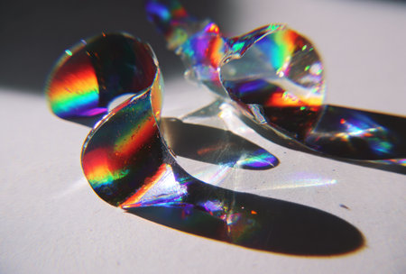Close-up of translucent, curled ribbons reflecting light, creating rainbow spectrums