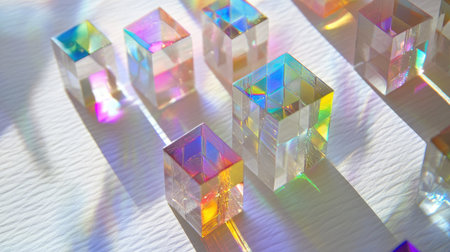 Spectrum of light from colored dichroic glass cubes, sparkling on textured white paper, showcasing artistic light dispersion.