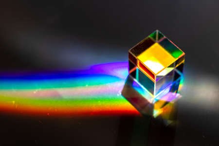 Glass cube with color spectrum rays. Abstract background with reflection and refraction of light.