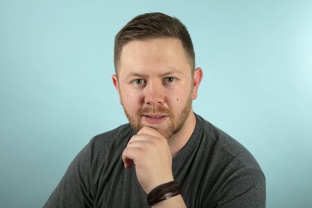 Bearded casual young man in a grey t-shirt looking pensively at the camera with his hand to his chin in a close up frontal studio portrait