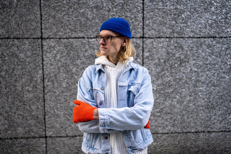 Young hipster millennial with glasses look away while standing with crossed arms against gray wall