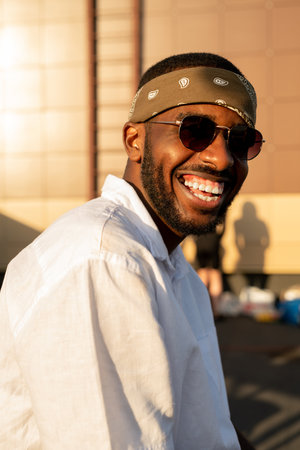 Cheerful African guy in white shirt, sunglasses and headband enjoying outdoor party