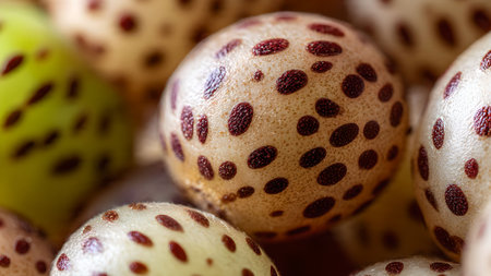 Close up of quail eggs with brown spots. Macro shot of speckled eggs. Selective focus on fresh eggs.